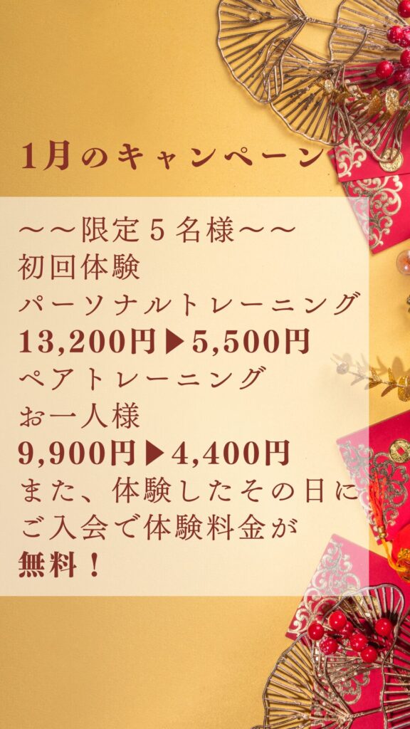 | パーソナルトレーニング 90分 | 13,200円→限定5名5,500円 (初回カウンセリング+姿勢スクリーニング付) さらに体験したその日にご入会で体験料金が無料! |